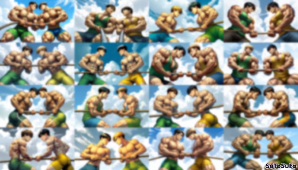 Their arms flex like drawn bows, torsos gleaming with strain. The rope creaks. No one's winning, but neither believes in losing. 🧵